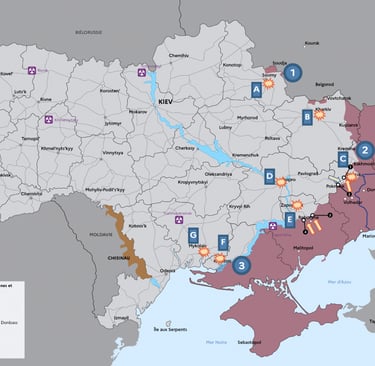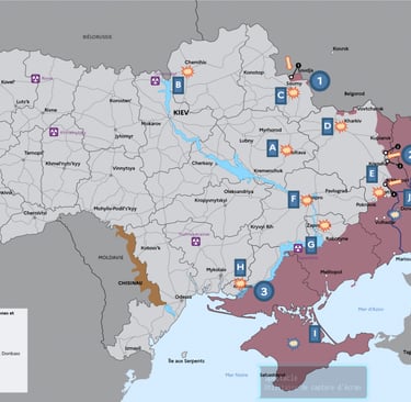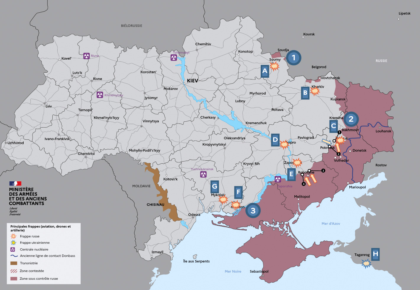 de Zaporijjia [E], de Kherson [F] et de Mykolaïv [G]. Les FAFR ont ciblé des infrastructures civiles : énergétiques, résidentielles et ferroviaires.